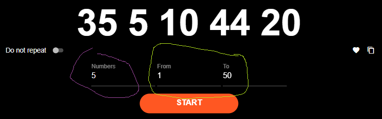El botón naranja funciona para iniciar y finalizar el proceso por el cuál se eligen los números. Por último, el botón de "Do not repeat" sirve para evitar repeticiones de cifras.