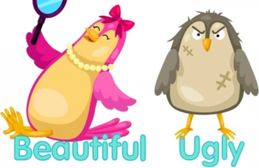 The adjectives are UGLY, HAPPY, OLD, BEAUTIFUL, SAD, YOUNG and BIG. Los adjetivos son FEO, FELIZ, VIEJO, HERMOSO, TRISTE, JOVEN y GRANDE.