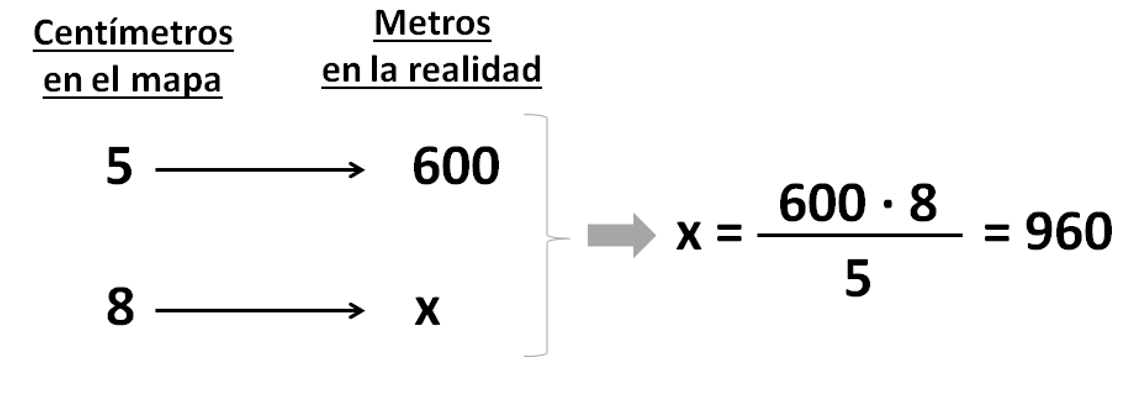 Al llegar al hotel nos han dado un mapa con los lugares de interés de la ciudad, y nos han dicho que 5 centímetros del mapa representan 600 metros de la realidad. Hoy queremos ir a un parque que se encuentra a 8 centímetros del hotel en el mapa. ¿A qué distancia del hotel se encuentra este parque?