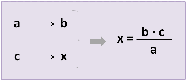 Colocaremos en una tabla los 3 datos (a los que llamamos “a”, “b” y “c”) y la incógnita, es decir, el dato que queremos averiguar (que llamaremos “x”). Después, aplicaremos la siguiente fórmula:
