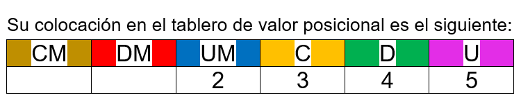 En la cifra 2345, el dígito 5 representa cinco unidades, el dígito 4 representa cuatro decenas, el 3 corresponde a la tercera posición de izquierda a derecha y por tanto el 3 representa tres centenas, por último el 2 representa dos millares. Es decir en notación desarrollada o extendida la cifra 2345 se escribe así: